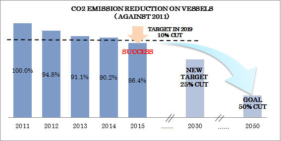 Therefore, we successfully accomplished ahead of schedule the CO2 emission reductions target by 10% for 2019 against 2011 level, which is one of our interim milestones by 2019, the 100th anniversary year of our foundation, under "K" Line Environmental Vision 2050 ~Securing Blue Seas for Tomorrow~*2 as a long-term objective toward 2050 established in Mar